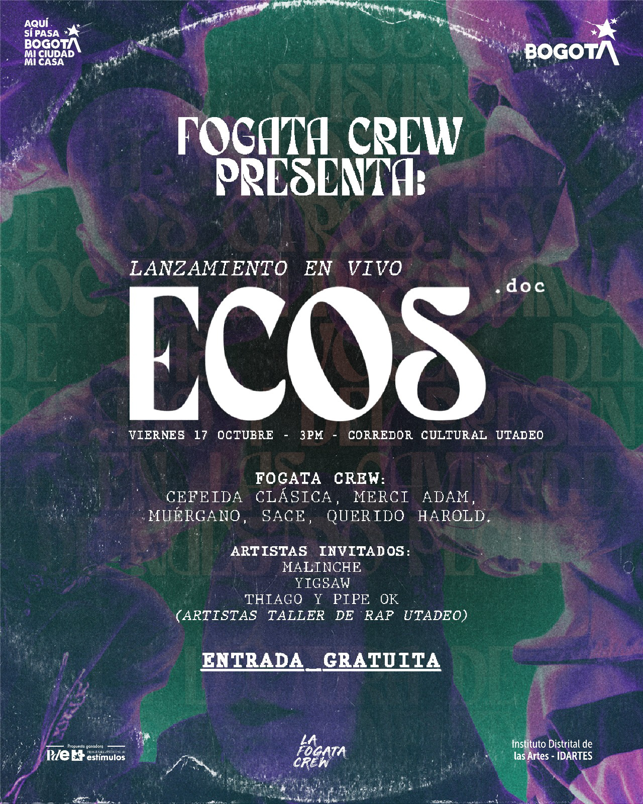 Llego el momento de disfrutar en vivo ECOS.doc, el primer álbum musical producido por el colectivo Fogata Crew, una fusión de sonidos tradicionales y urbanos que trascienden. Vive una experiencia musical en este viaje sonoro que conecta con la historia del país, y te hará reflexionar, alzar los brazos al ritmo del beat y por que no bailar